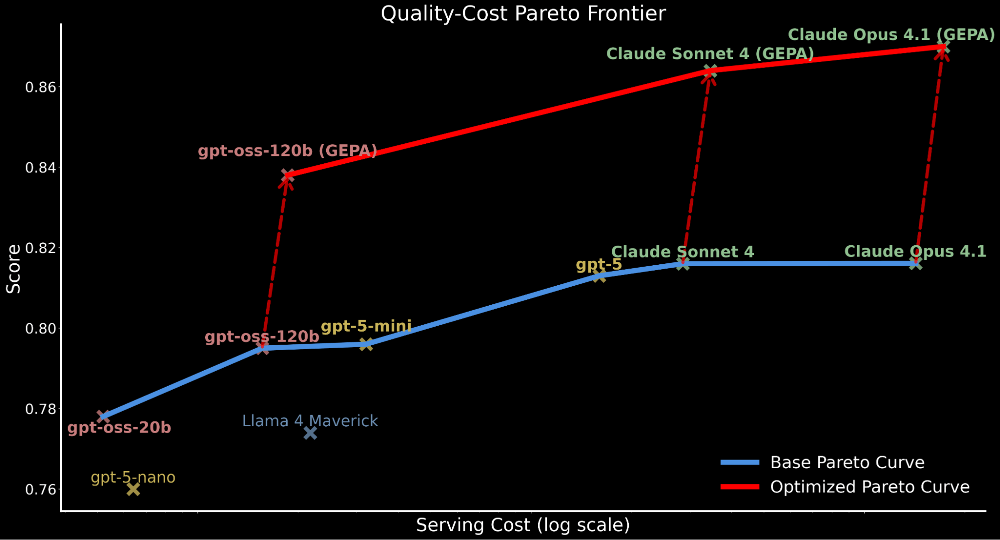 We improved gpt-oss-120b to surpass GPT-5 and Claude Opus 4.1 on enterprise-scale information extraction. Optimized with GEPA (a new technique from Databricks + UC Berkeley), gpt-oss-120b outperforms Opus 4.1 by +3% while being 90× cheaper to serve. GEPA combines natural language reflection (to capture high-level task rules) with evolutionary search (to explore optimal prompts), and the results are remarkable.